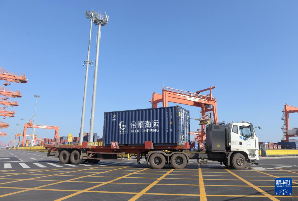 9月23日,一辆电动重卡在唐山港京唐港区集装箱码头运送货物。