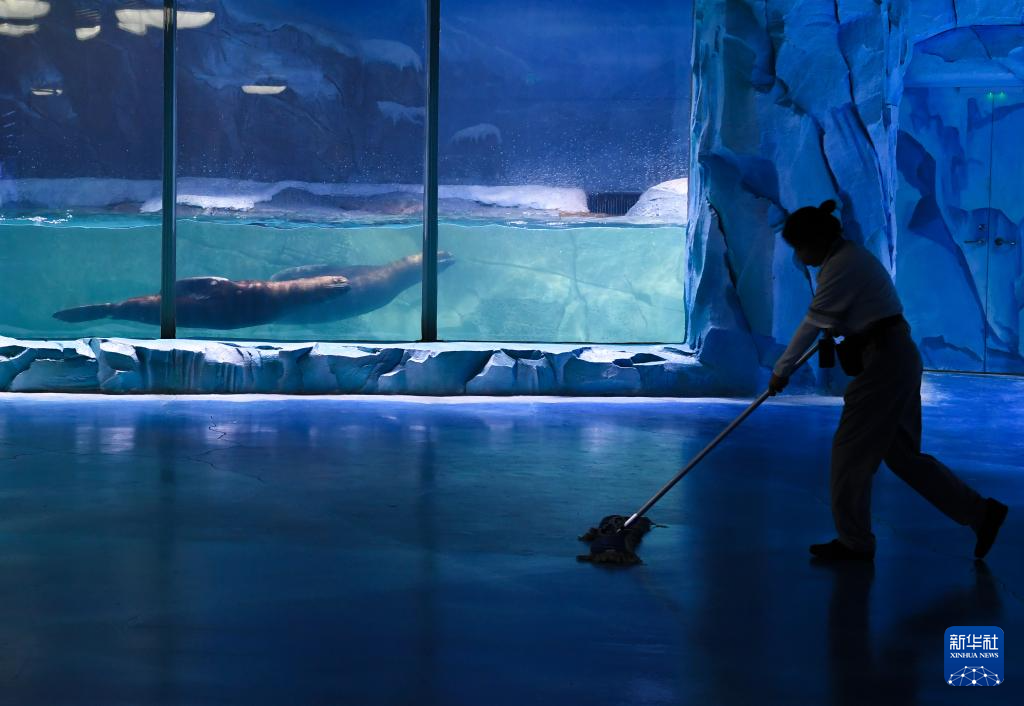 9月25日,深圳市盐田区小梅沙海洋世界,工作人员清理海狮展区的地面。