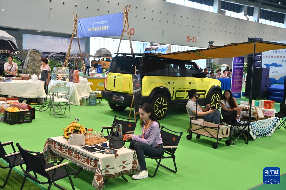 9月26日,观众在第21届中国—东盟博览会旅游展区体验户外露营用品。