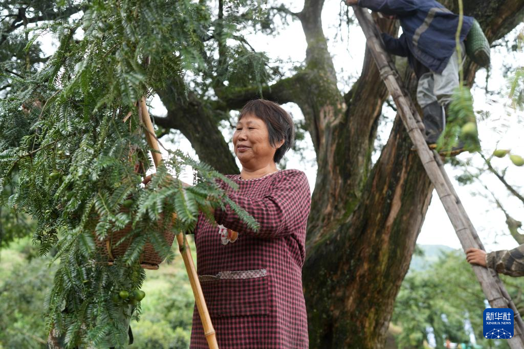 9月27日,在赵家镇香榧国家森林公园,榧农在采摘香榧。