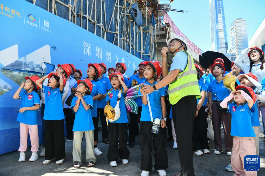 7月10日,来自23个建设者家庭的32名“小候鸟”在深圳与父母团聚,孩子们在父母参建的深圳湾文化广场项目工地参观。