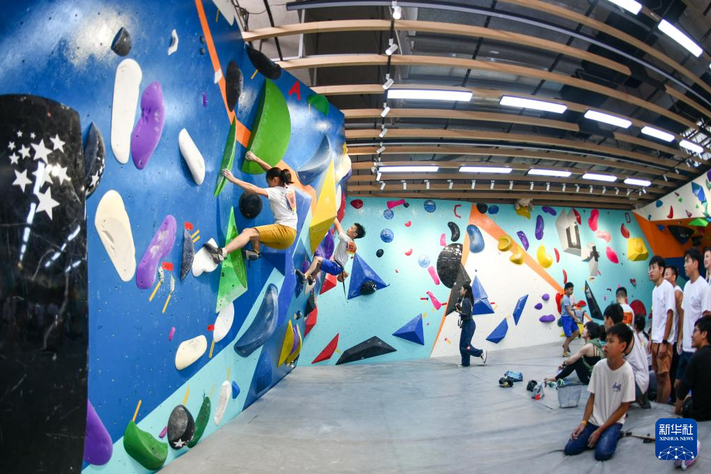 9月22日,攀岩爱好者们在深圳市福田区一家攀岩馆内参加交流赛。