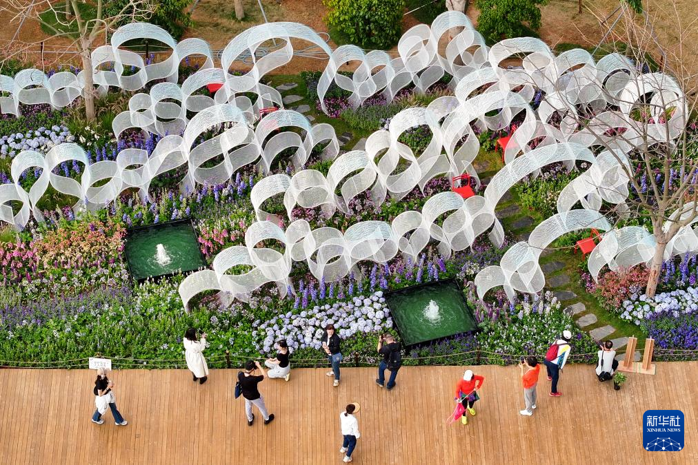 3月22日,观众在深圳笔架山体育公园观赏2024粤港澳大湾区花展参展作品(无人机照片)。