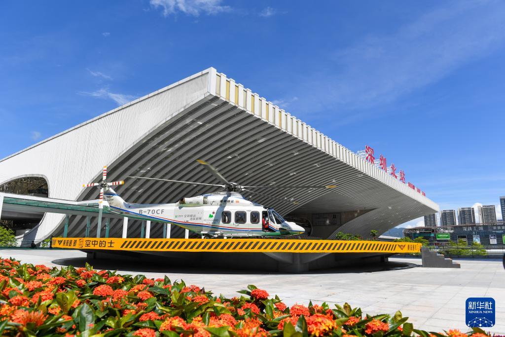 6月28日,直升机在深圳北站旁的停机坪等待起飞。深圳首个“低空+轨道”空铁联运项目当天正式开航,将为旅客提供空铁交通一站式接驳服务。