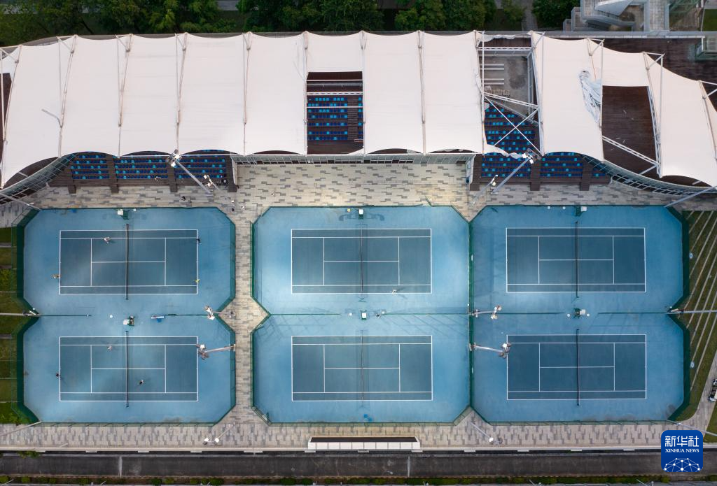 9月15日,在深圳市南山区一处屋顶运动场,市民在打网球(无人机照片)。