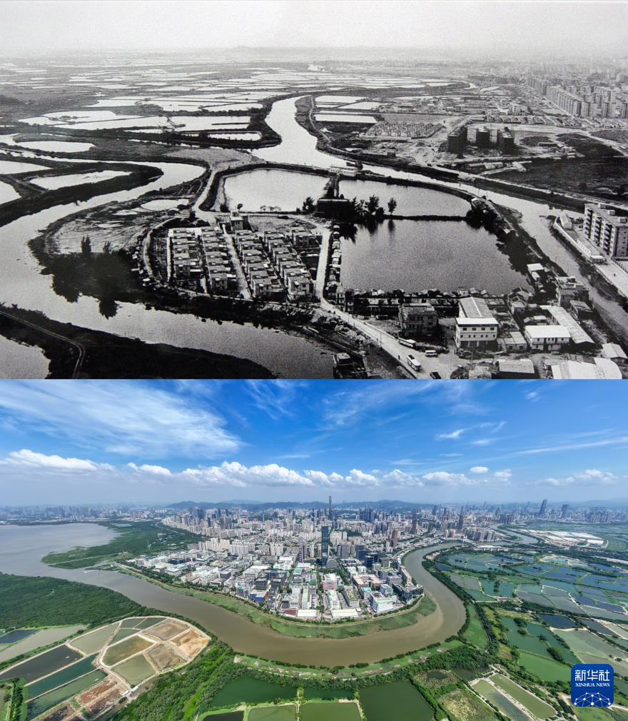 拼版照片:上图为20世纪80年代初的深圳渔民村及深圳河两岸(资料照片);下图为9月19日拍摄的河套深港科技创新合作区及深圳河两岸(新华社记者毛思倩摄,无人机照片)。
