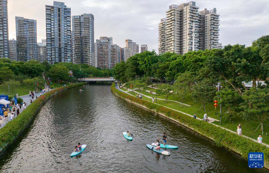 9月16日,市民和游客在深圳市南山区的中心河体验浆板运动(无人机照片)。