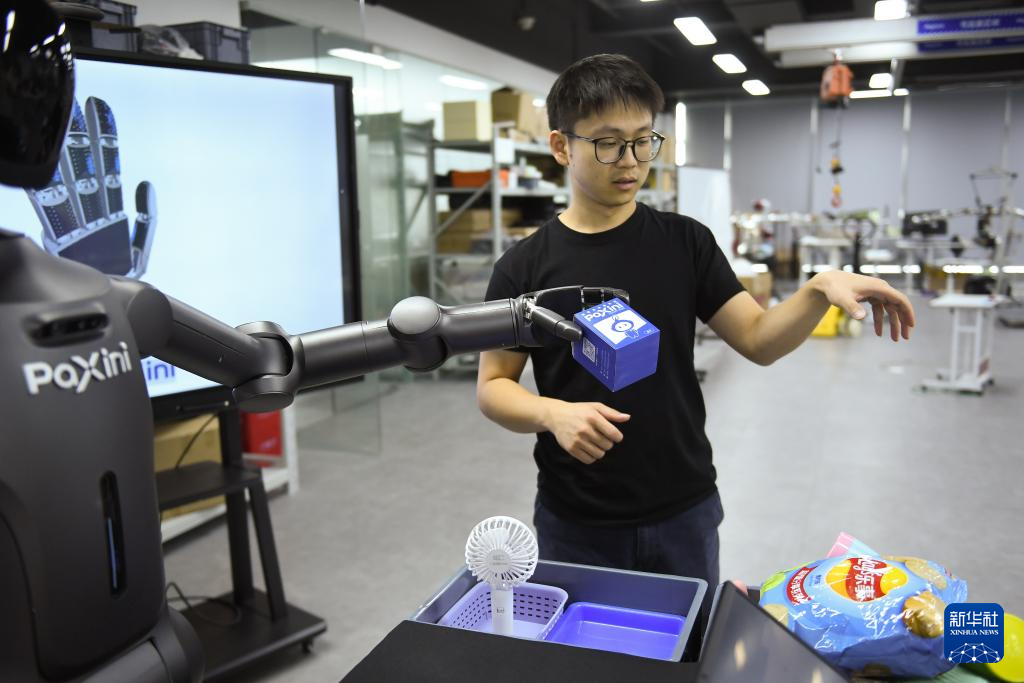 6月28日,在帕西尼感知科技(深圳)有限公司的实验室,工作人员测试人形机器人的手指抓握能力。