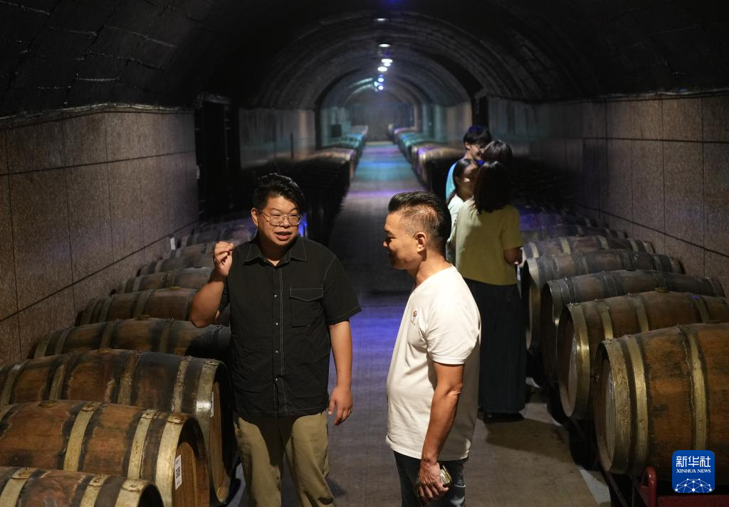9月26日,徐豪在酒窖里介绍葡萄酒的酿制工艺。