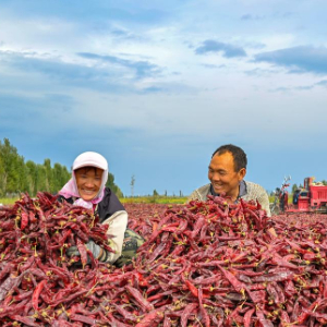眼下正是新疆辣椒丰收的好时节。在新疆巴音郭楞蒙古自治州博湖县辣椒晾晒场上,村民抢抓晴好天气,对收获的辣椒进行集中晾晒、分拣、装袋。