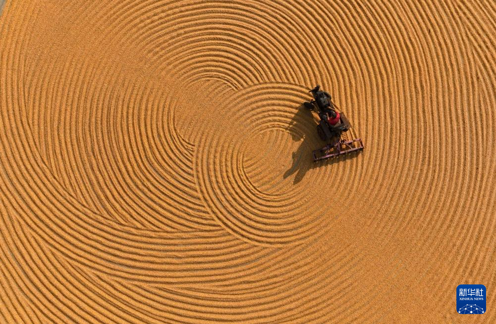9月25日,河南省济源市克井镇农民在晾晒玉米(无人机照片)。