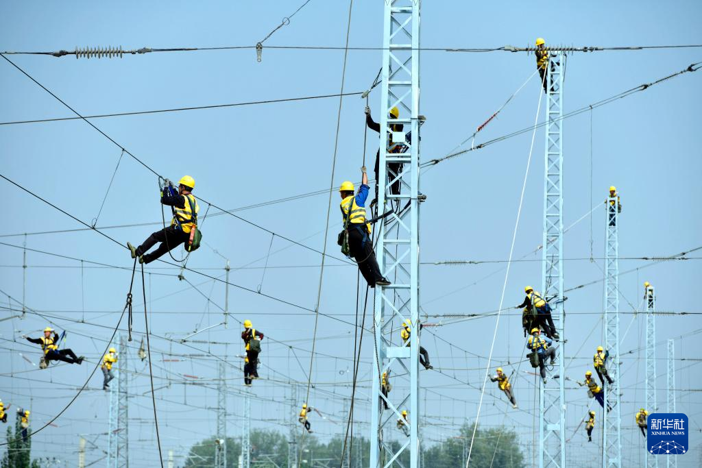 9月25日,在雄商高铁山东省郓城段,中铁十局的工作人员在郓城站进行接触网软横跨安装施工。