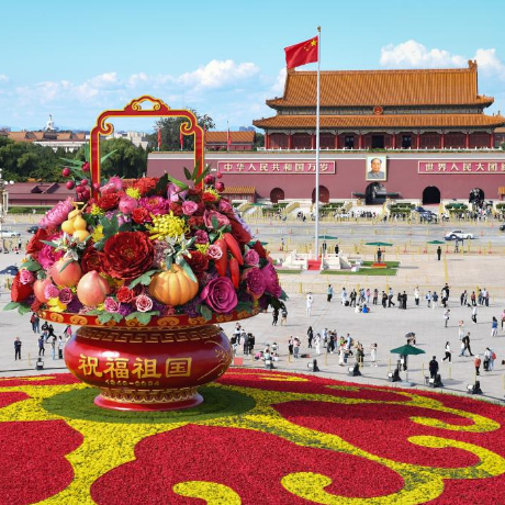 9月25日拍摄的天安门广场“祝福祖国”巨型花篮。