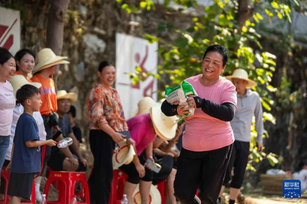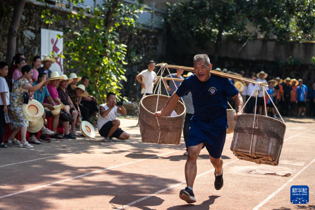 9月28日,在桃江县高桥镇中心学校,村民在进行运粮接力比赛。