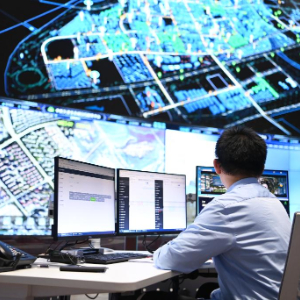 9月27日,工作人员在中新天津生态城智慧城市运营中心内监控。