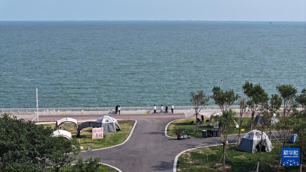 9月27日,游人在中新天津生态城东堤公园观海(无人机照片)。