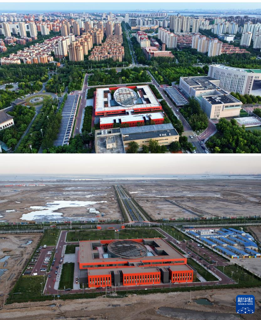 拼版照片:上图为2024年9月27日拍摄的中新天津生态城一景(无人机照片,新华社记者赵子硕摄);下图为2009年拍摄的中新天津生态城一景(资料照片,新华社发)。