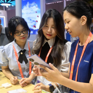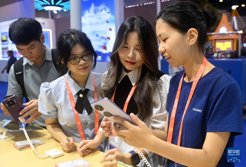 9月28日,在广西南宁国际会展中心,参展人员(右一)向观众推介手机产品。