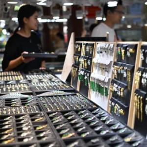 这是9月27日在揭阳百分玉器广场拍摄的翡翠首饰摊位。