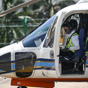 9月29日,在三亚至湛江直升机航线首飞前,工作人员在三亚天涯直升机场进行准备工作。