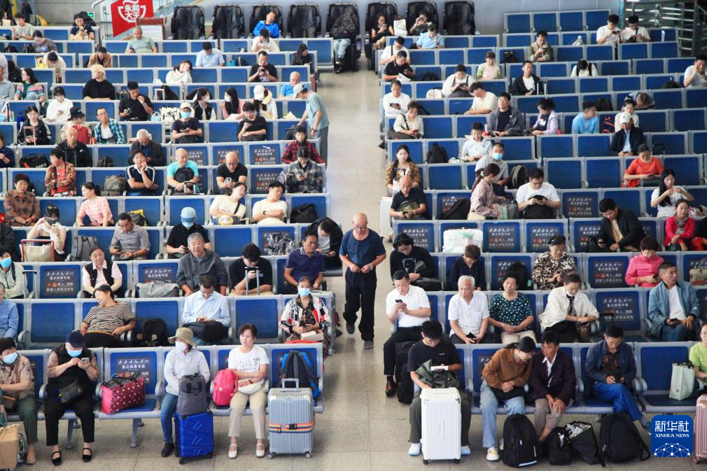 9月29日,旅客在贵阳北站候车大厅排队检票。