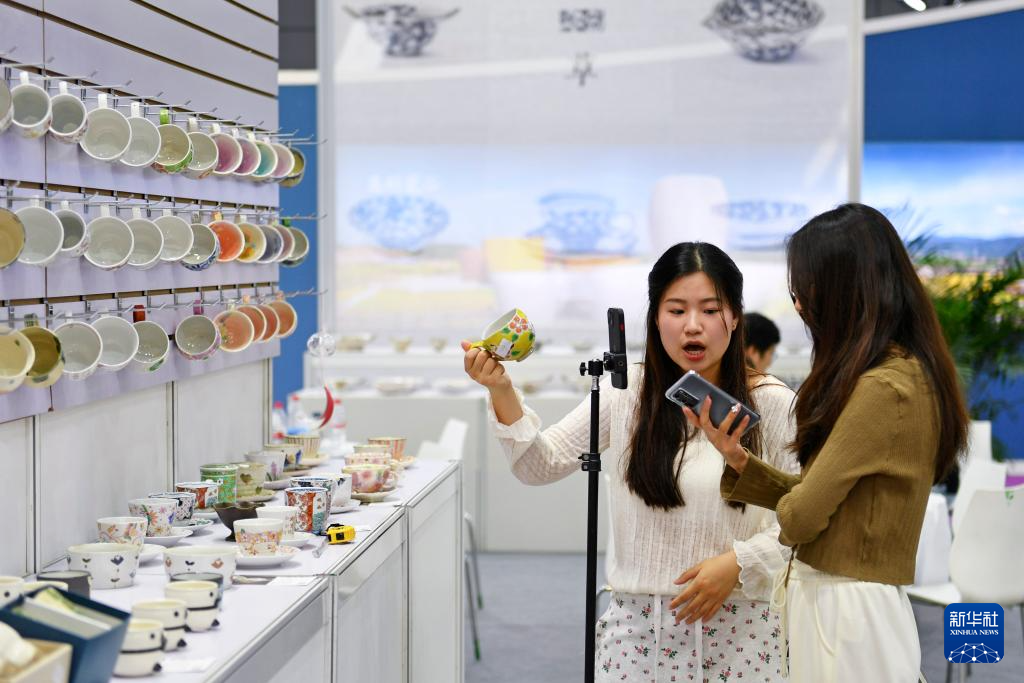9月29日,参展商在2024湖南(醴陵)国际陶瓷产业博览会上直播推荐产品。