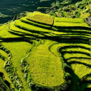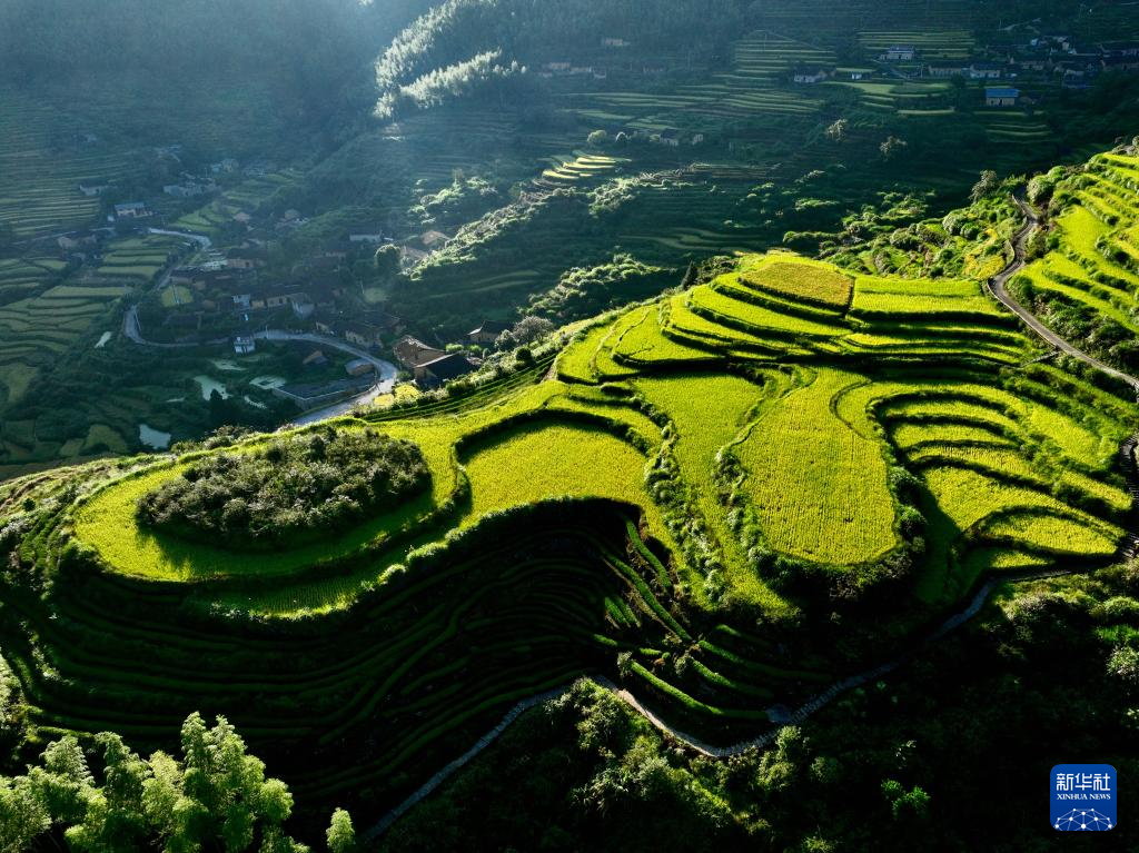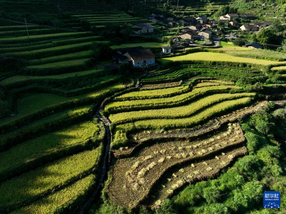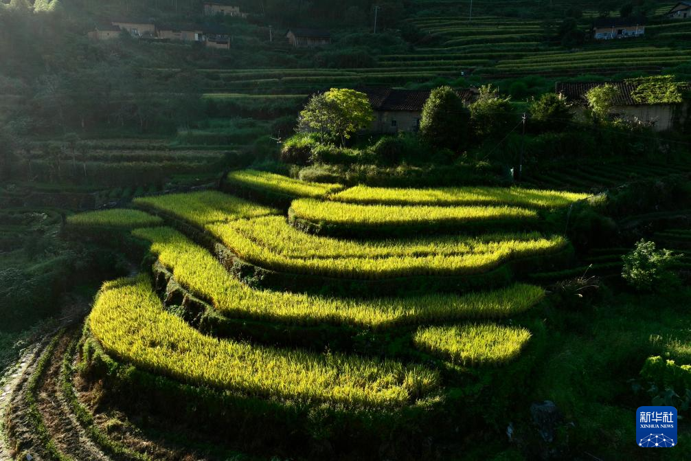 时下正值福建晚稻成熟收获季节,武夷山市吴屯乡后源村千亩梯田稻谷呈现一派迷人的秋景。