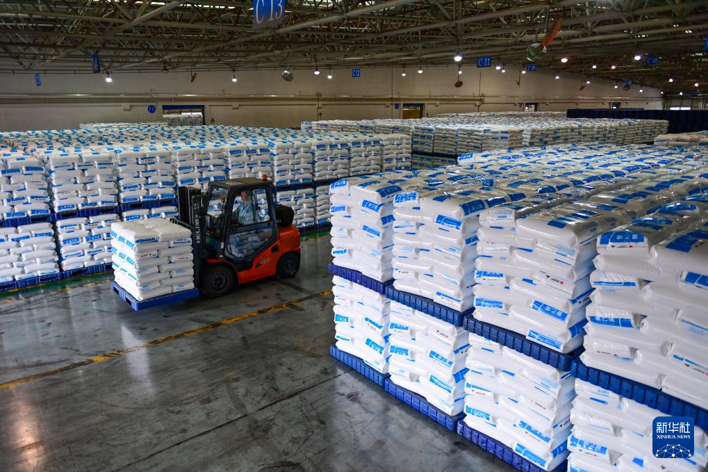 在国能新疆化工有限公司,工作人员驾驶机械运送袋装聚乙烯产品(9月26日摄)。