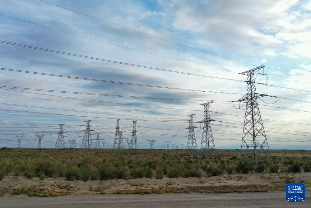 这是在新疆准东经济技术开发区拍摄的一处疆电外送输电线路(9月26日摄,无人机照片)。