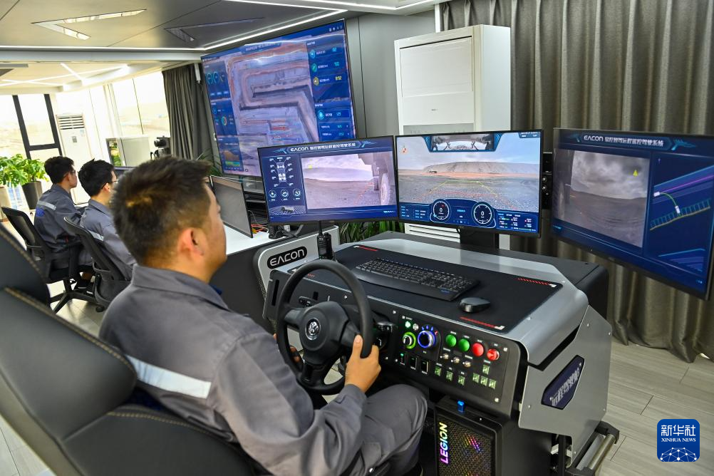 在国能新疆准东能源有限责任公司准东露天煤矿智能云控中心,工作人员进行车辆调配、线路规划和监测(9月26日摄)。
