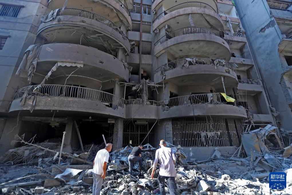 9月29日,在黎巴嫩首都贝鲁特南郊,人们查看空袭后的建筑废墟。