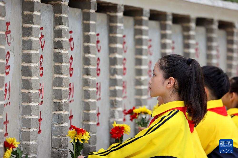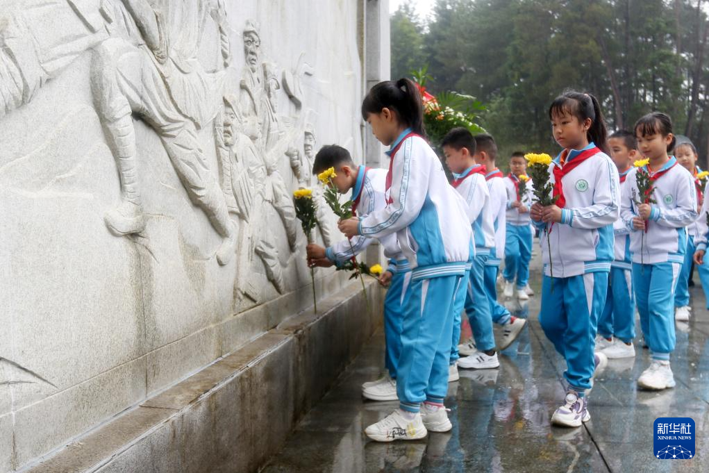 9月30日,在贵州省铜仁市玉屏侗族自治县小凤山烈士陵园,学生向烈士敬献鲜花。