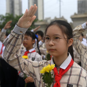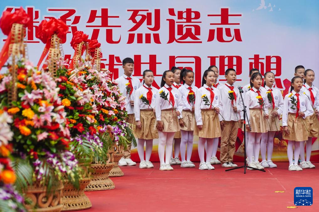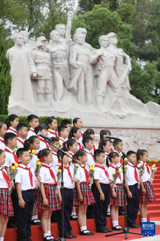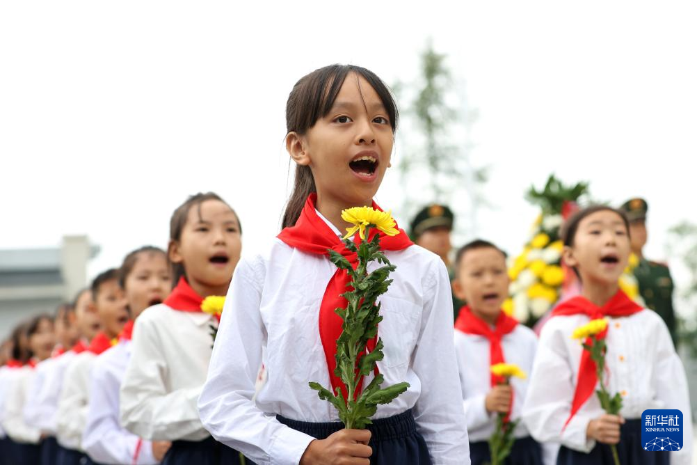 9月30日,四川省眉山市彭山区向英雄烈士敬献花篮仪式在彭山区烈士陵园举行,少先队员在仪式上合唱《我们是共产主义接班人》。