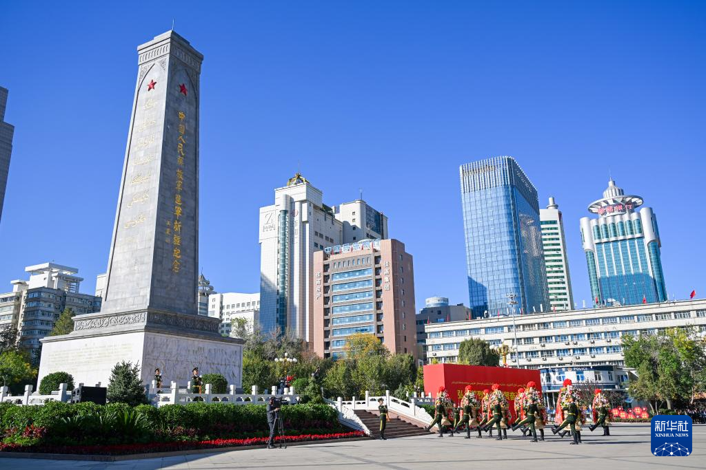 9月30日,在新疆乌鲁木齐人民广场举行的向人民英雄敬献花篮仪式上,礼兵托起花篮缓步走向中国人民解放军进军新疆纪念碑。
