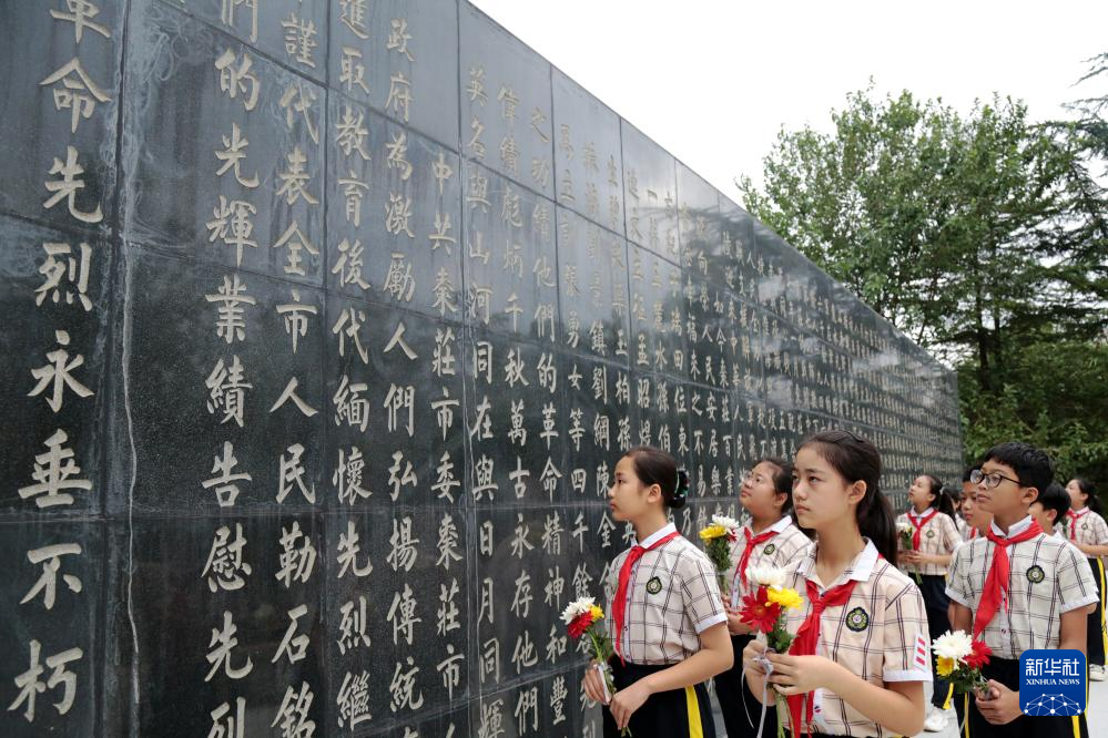 9月30日,山东省枣庄市光明路小学的学生在枣庄革命烈士陵园向无名烈士献花。