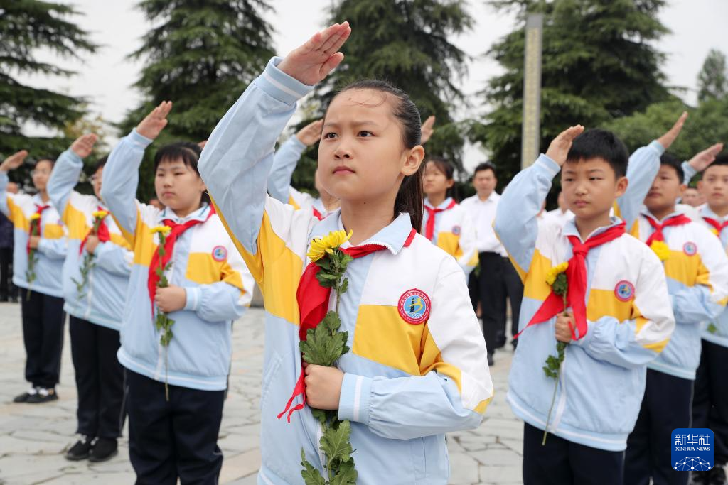 9月30日,在安徽省亳州市蒙城县烈士陵园,少先队员在烈士纪念碑前敬礼。