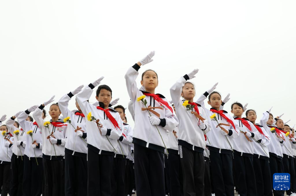 9月30日,在河南省南阳市烈士陵园,南阳市第十五小学的学生在烈士纪念日主题活动中合唱《中国少年先锋队队歌》(无人机照片)。