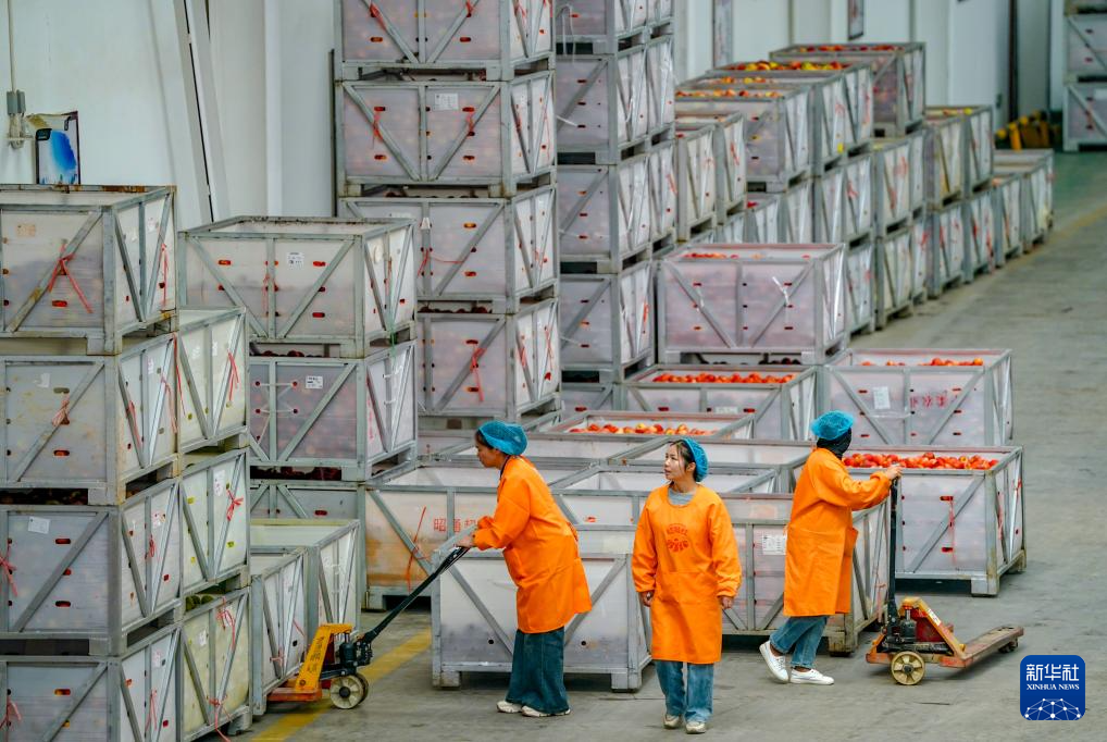 9月29日,工作人员在昭通市超越苹果基地苹果分选车间内运苹果。