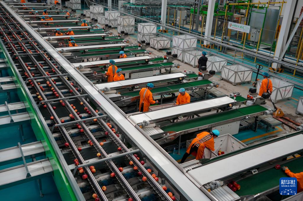 9月29日,工作人员在昭通市超越苹果基地苹果包装车间工作。