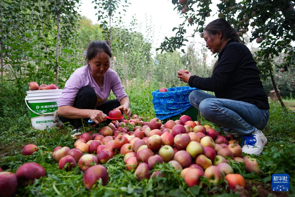 9月29日,在昭通市昭阳区洒渔镇,两名当地果农在果园内对刚采摘的苹果进行初步分级。