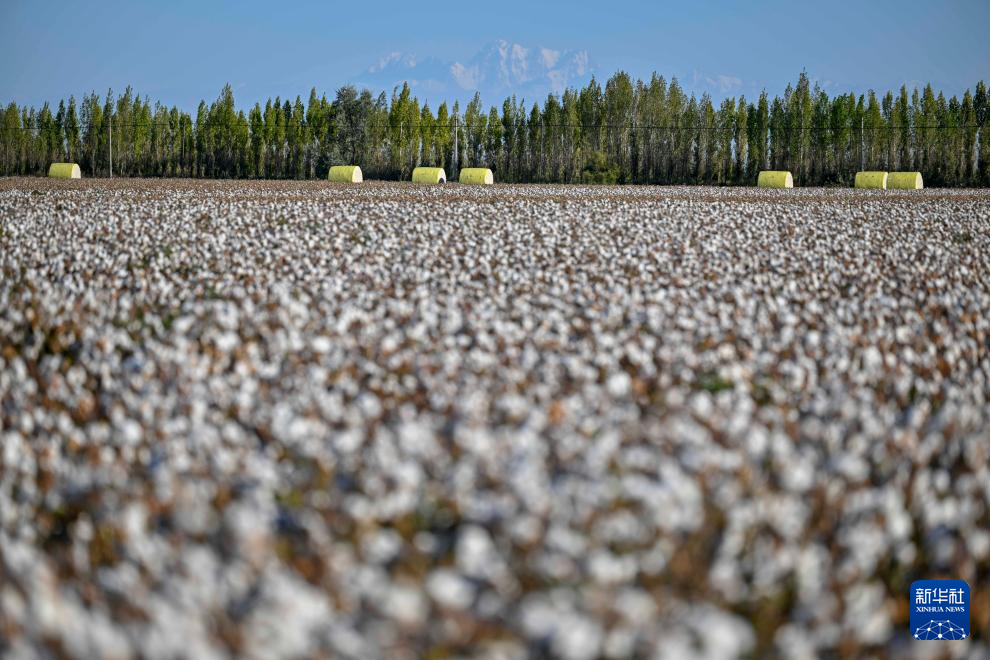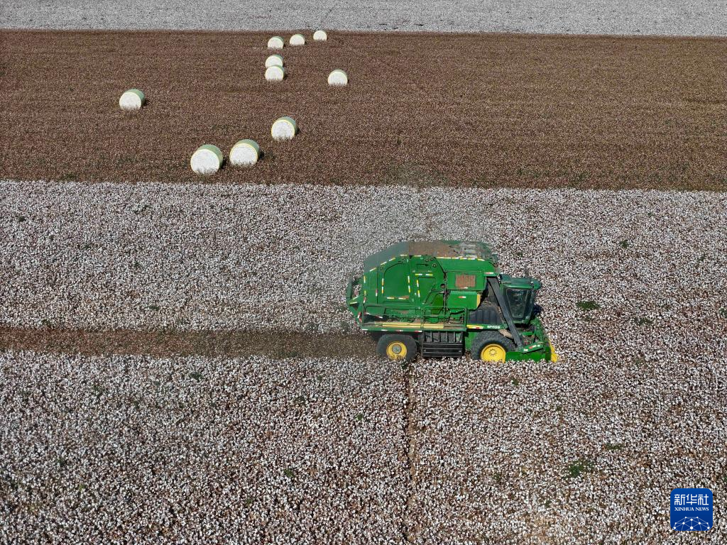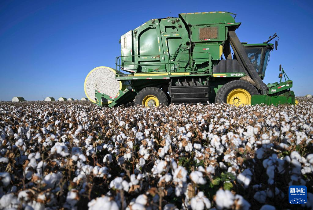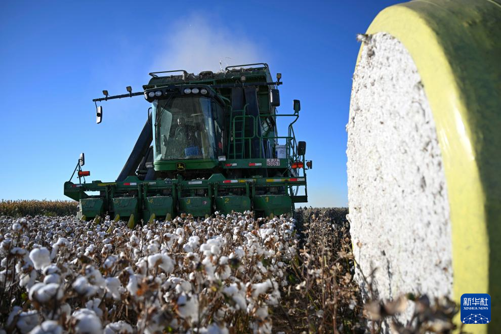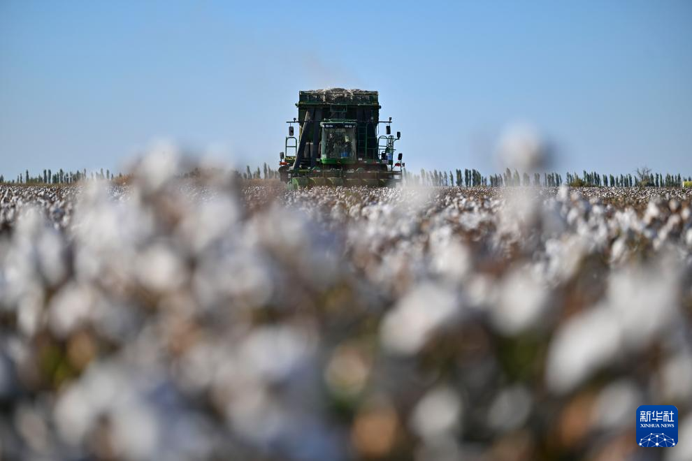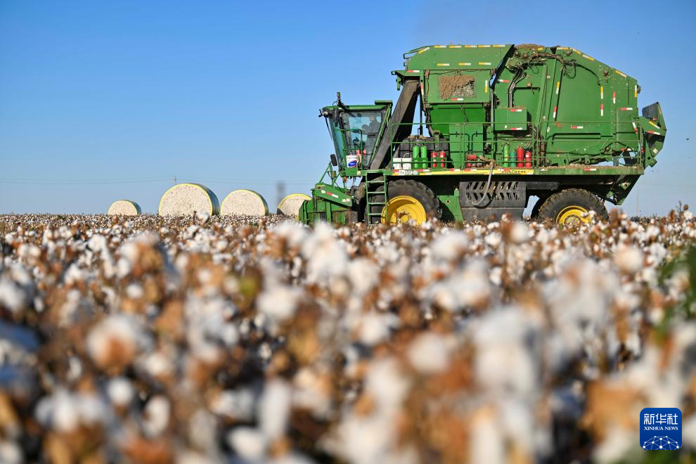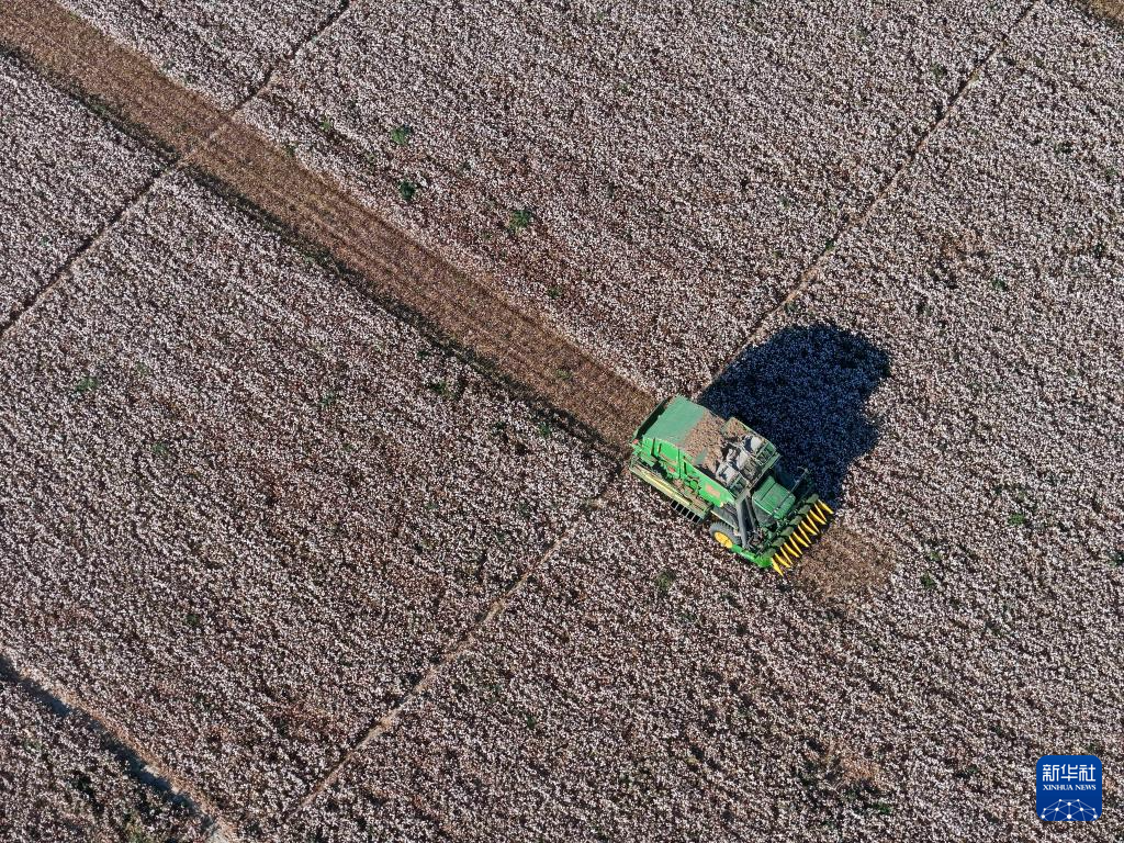 金秋时节,新疆生产建设兵团1100多万亩棉花陆续进入采收季。田间“白浪”翻滚,机器轰鸣,团场职工抓住晴好天气,收获棉花。
