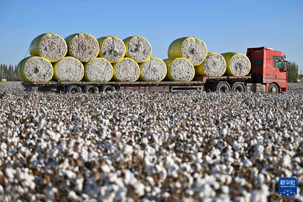 在新疆生产建设兵团第六师五家渠市,货车载着收获的棉花行驶(9月29日摄)。