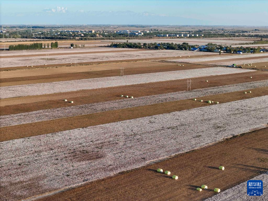 采棉机在新疆生产建设兵团第六师五家渠市105团的棉田采收棉花,由采棉机自动完成打包的棉花摆放在田间(9月29日摄,无人机照片)。
