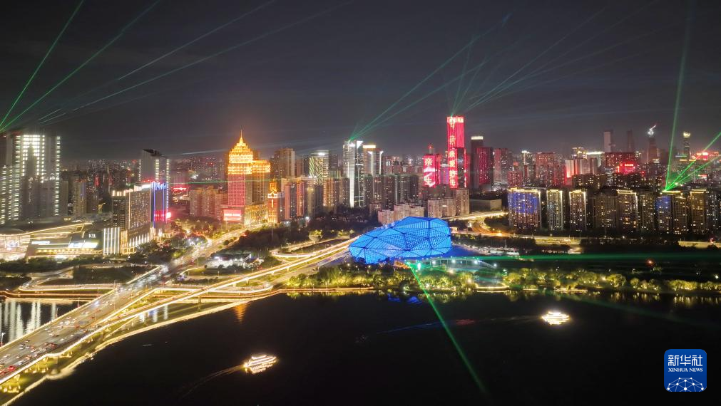 10月1日在辽宁沈阳拍摄的灯光秀(无人机照片)。