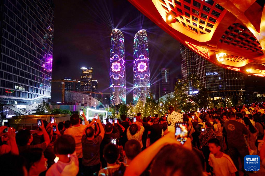 10月1日,市民在四川省成都市交子大道观看灯光秀表演。