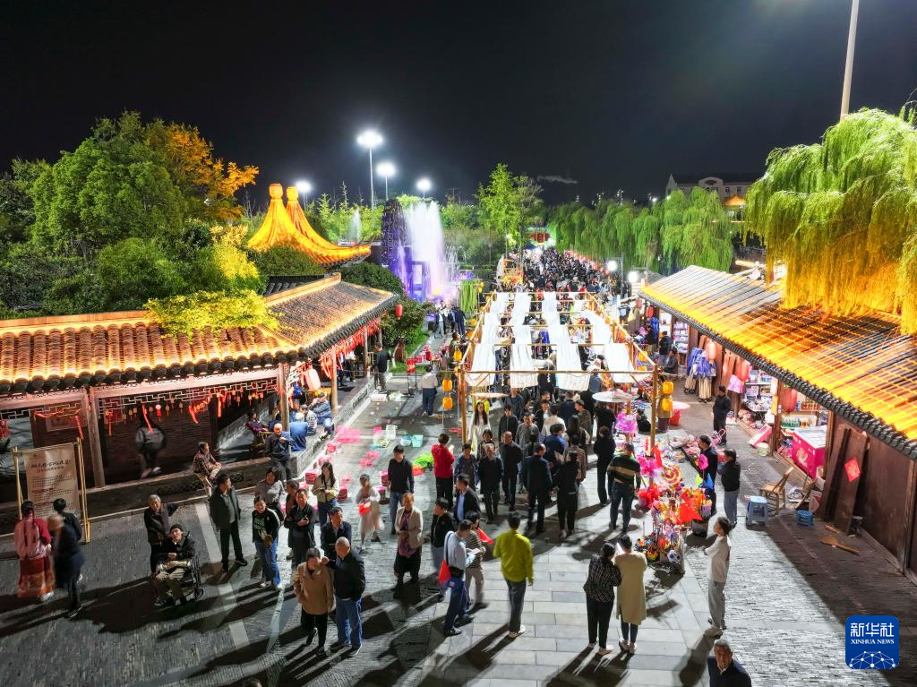10月1日,市民游客在江苏省泰州市口岸雕花楼景区逛夜市(无人机照片)。