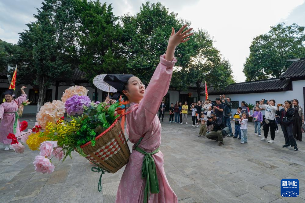 10月1日,在四川省巴中市恩阳古镇,游客观看文艺表演。