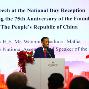 9月24日,在泰国曼谷,泰国国会主席兼下议长万·穆罕默德·努尔·玛他在中国驻泰国大使馆国庆75周年招待会上致辞。