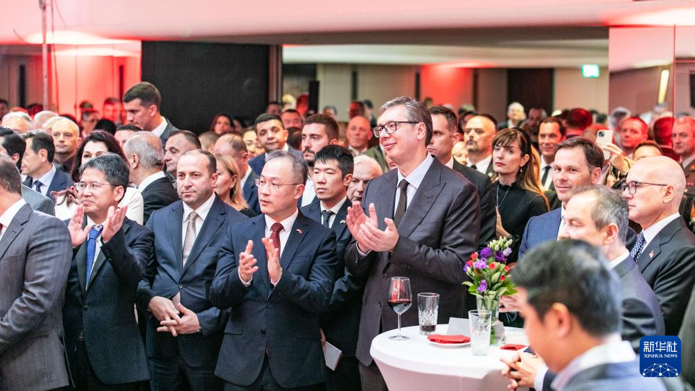 9月18日,在塞尔维亚首都贝尔格莱德,塞尔维亚总统武契奇(前中右)出席中国驻塞尔维亚大使馆国庆75周年招待会。