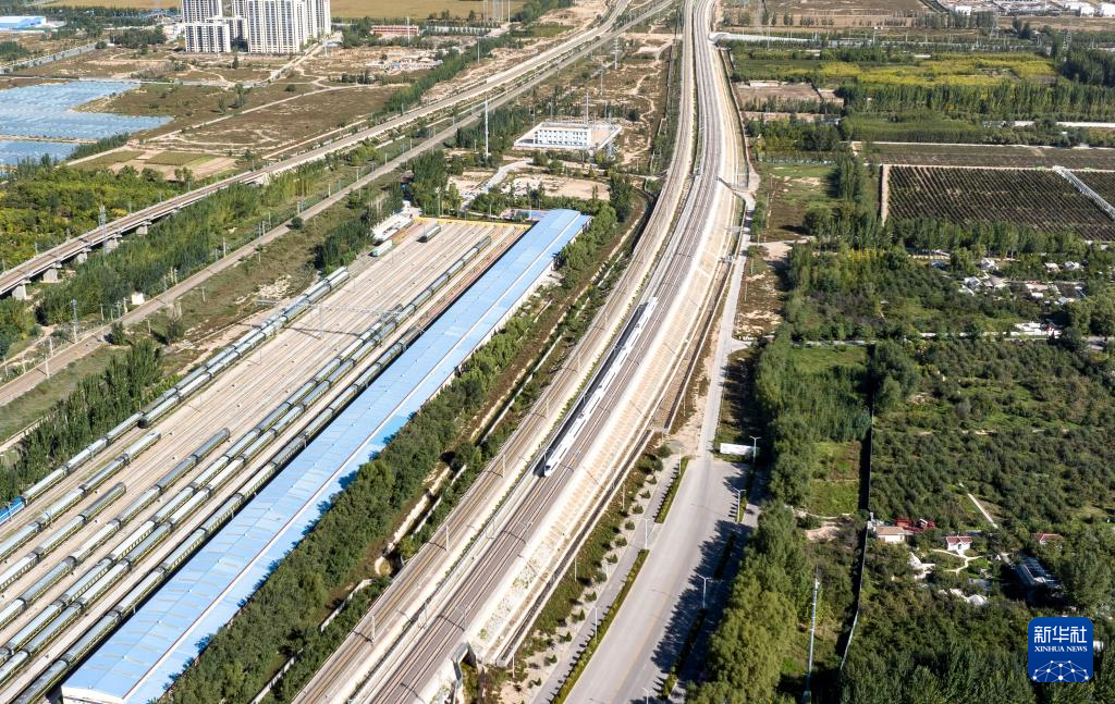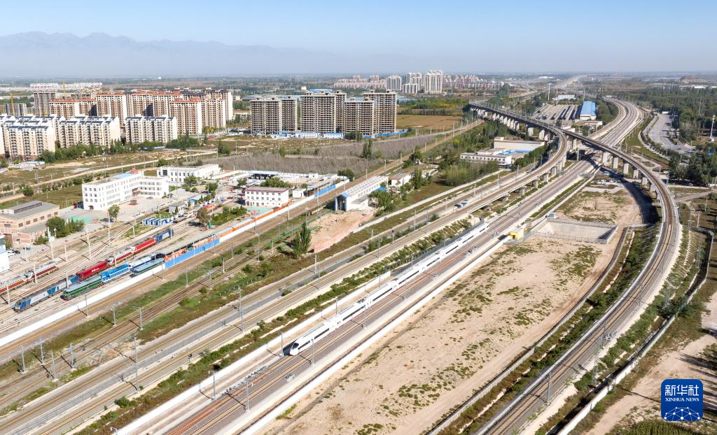 10月1日,一列动车组列车从包银高铁惠银段石嘴山站驶出(无人机照片)。